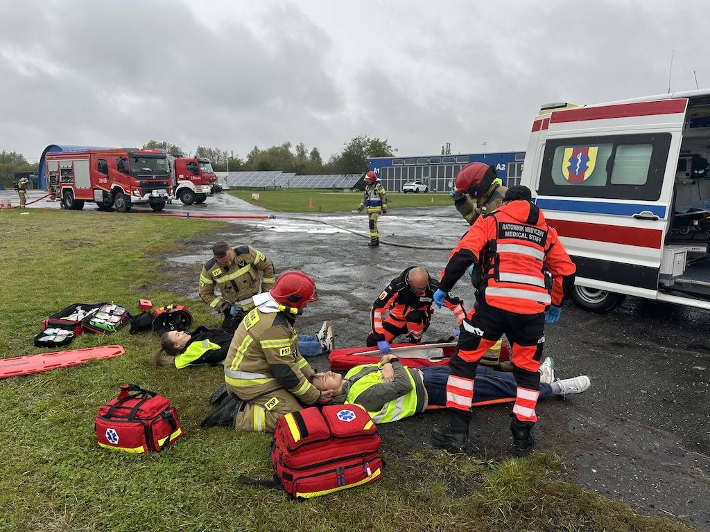 Na sygnał alarmowy natychmiast zareagowały służby. Strażacy błyskawicznie zabezpieczyli miejsce pozorowanej katastrofy, wykorzystując pianę gaśniczą, a następnie wydobyli nieprzytomną załogę samolotu. Równolegle zespoły ratownictwa medycznego udzieliły pierwszej pomocy i przetransportowały „poszkodowanych" do szpitala. Teren lotniska został zabezpieczony przez policję, a operacje lotnicze wstrzymano na czas akcji ratowniczej, zgodnie z wydanym NOTAM-em – oficjalnym ostrzeżeniem dla ruchu lotniczego.
