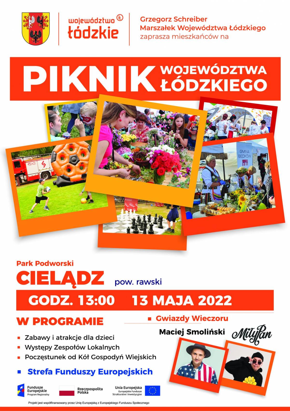 Marszałek Grzegorz Schreiber zaprasza na czwarty Piknik Województwa Łódzkiego. Już w piątek, 13 maja o godzinie 13:00 spotkamy się w 𝗣𝗮𝗿𝗸𝘂 𝗣𝗼𝗱𝘄𝗼𝗿𝘀𝗸𝗶𝗺 w Cielądzu.