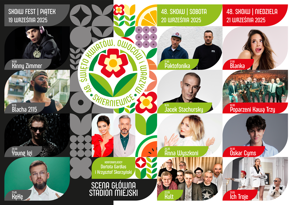Skierniewice po raz kolejny zamienią się w wielobarwne centrum muzyki, emocji i wspólnego świętowania. W dniach 19–21 września 2025 roku odbędzie się 48. edycja Święta Kwiatów, Owoców i Warzyw – wydarzenia, które z powodzeniem aspiruje do miana nowoczesnego, wielowymiarowego festiwalu miejskiego. Łącząc niemal 50-letnią tradycję z nowoczesną formułą, święto wciąż pozostaje żywym symbolem lokalnej tożsamości, integracji i kultury.