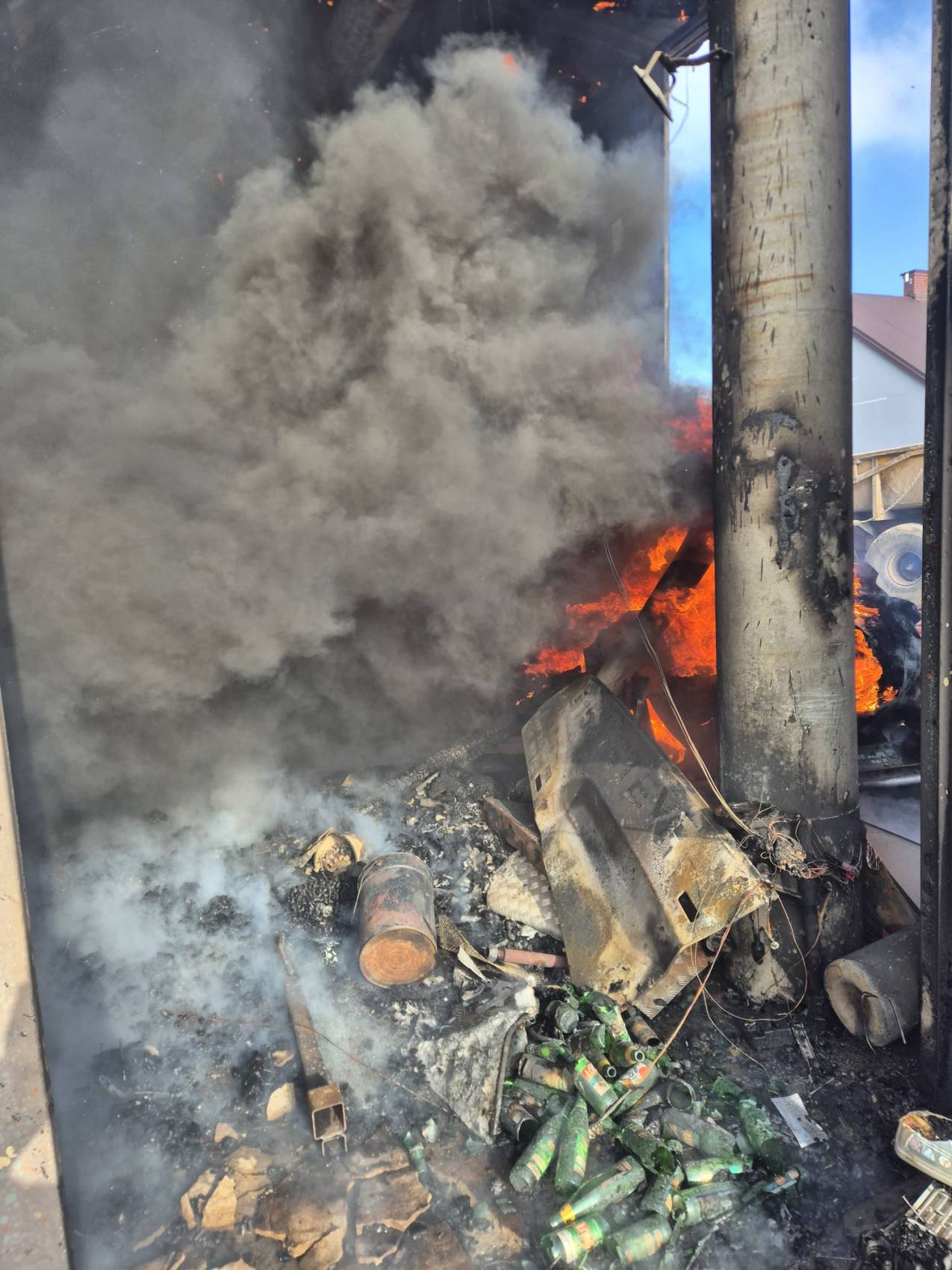 Po dojeździe pierwszych zastępów na miejsce strażacy zastali w pełni rozwinięty pożar części warsztatowej obiektu. Sytuacja była bardzo dynamiczna i wymagała natychmiastowych działań ratowniczych.