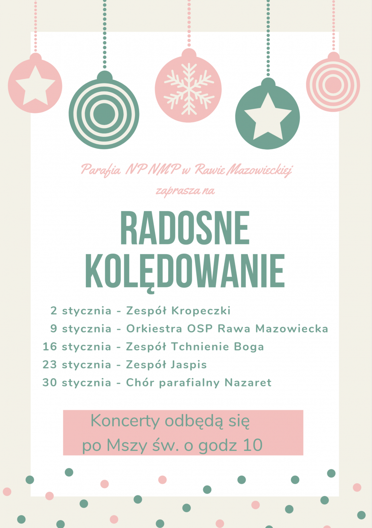 Przypominamy także, że w każdą niedzielę stycznia, po Mszy Św. o godzinie 10:00, odbywa się Radosne Kolędowanie. Harmonogram znajduje się poniżej.