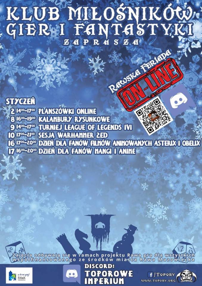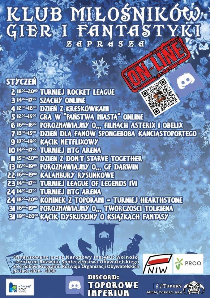 Klub Miłośników Gier i Fantastyki działający przy Stowarzyszeniu "Topory" przedstawił harmonogram zajęć zaplanowanych na styczeń 2021 r.