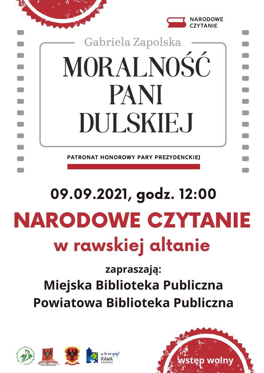 W tym roku cała Polska czytać będzie dramat Gabrieli Zapolskiej „Moralność pani Dulskiej". Wydarzenie odbędzie się 9 września (czwartek) o godz. 12.00 w rawskiej altanie. Wybierając się do Parku Miejskiego warto wziąć ze sobą własny egzemplarz dramatu – będzie można otrzymać na nim pamiątkową pieczątkę Narodowego Czytania.